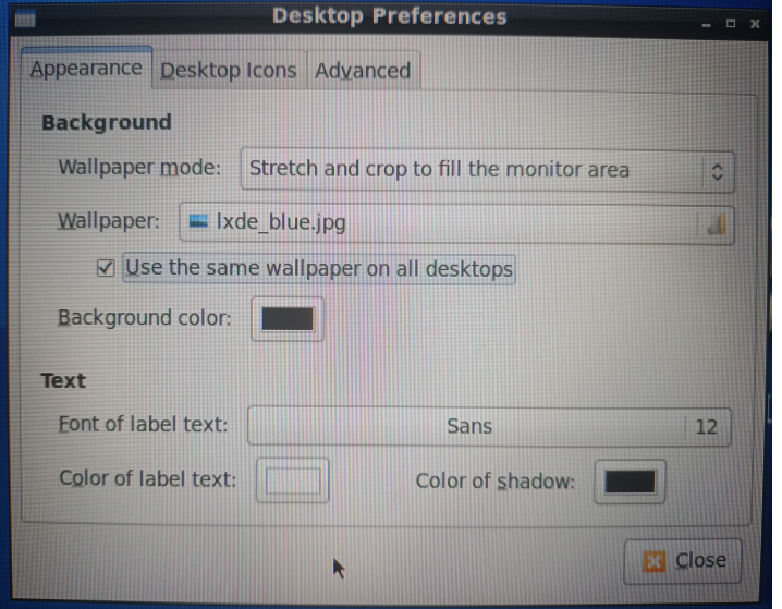 登录成功后,由于默认背景是黑色的,可以点击鼠标右键后选择Desktop Preferences->Appearance->Wallpaper(/usr/share/lxde/wallpapers/lxde_blue.jpg)来选择背景图片,如图4-2: