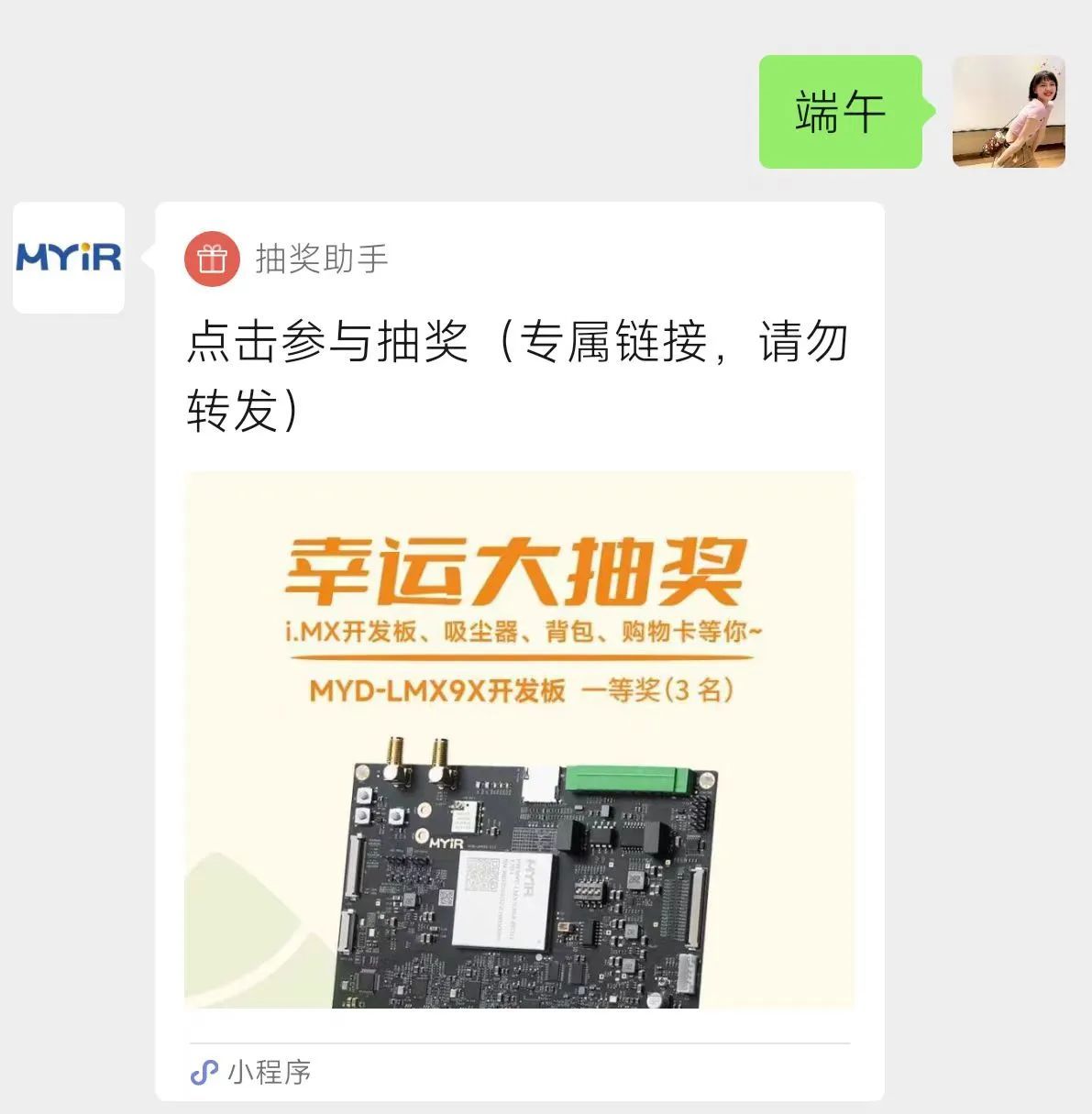 一等奖(3名) 九游老哥J9俱乐部官网基于NXP i.MX 93的开发板(价值678元) 二等奖(5名) 米家随手吸尘器(价值250元) 三等奖(8名) 九游老哥J9俱乐部官网定制背包(价值200元) 四等奖(10名) 50元京东卡 怎么参与? 第一步 微信扫码关注『九游老哥J9俱乐部官网MYiR』公众号 第二步 与公众号会话发送关键词【端午】,获取礼品抽奖链接。点击进入活动。 第三步 2024年06月20日12:00 自动开奖,敬请静候佳音。 第四步 中奖者请务必于开奖后在『抽奖助手』活动小程序中内填写收货地址,若24小时内没有填写地址视为弃权。『九游老哥J9俱乐部官网MYiR』公众号将于7月公布最终获奖名单。